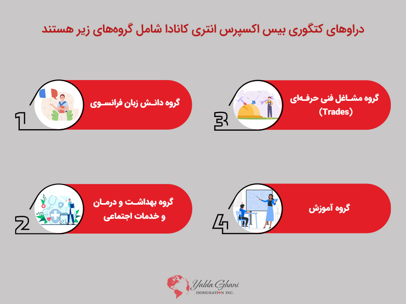 اداره مهاجرت کانادا در سال 2023 و برای اولین بار، 6 دسته یا گروه را برای دراوهای کتگوری بیس اکسپرس انتری معرفی کرد. البته بر اساس آپدیت سال 2025 اداره مهاجرت، این 6 دسته به 4 دسته تغییر پیدا کردند که عبارتند از:
